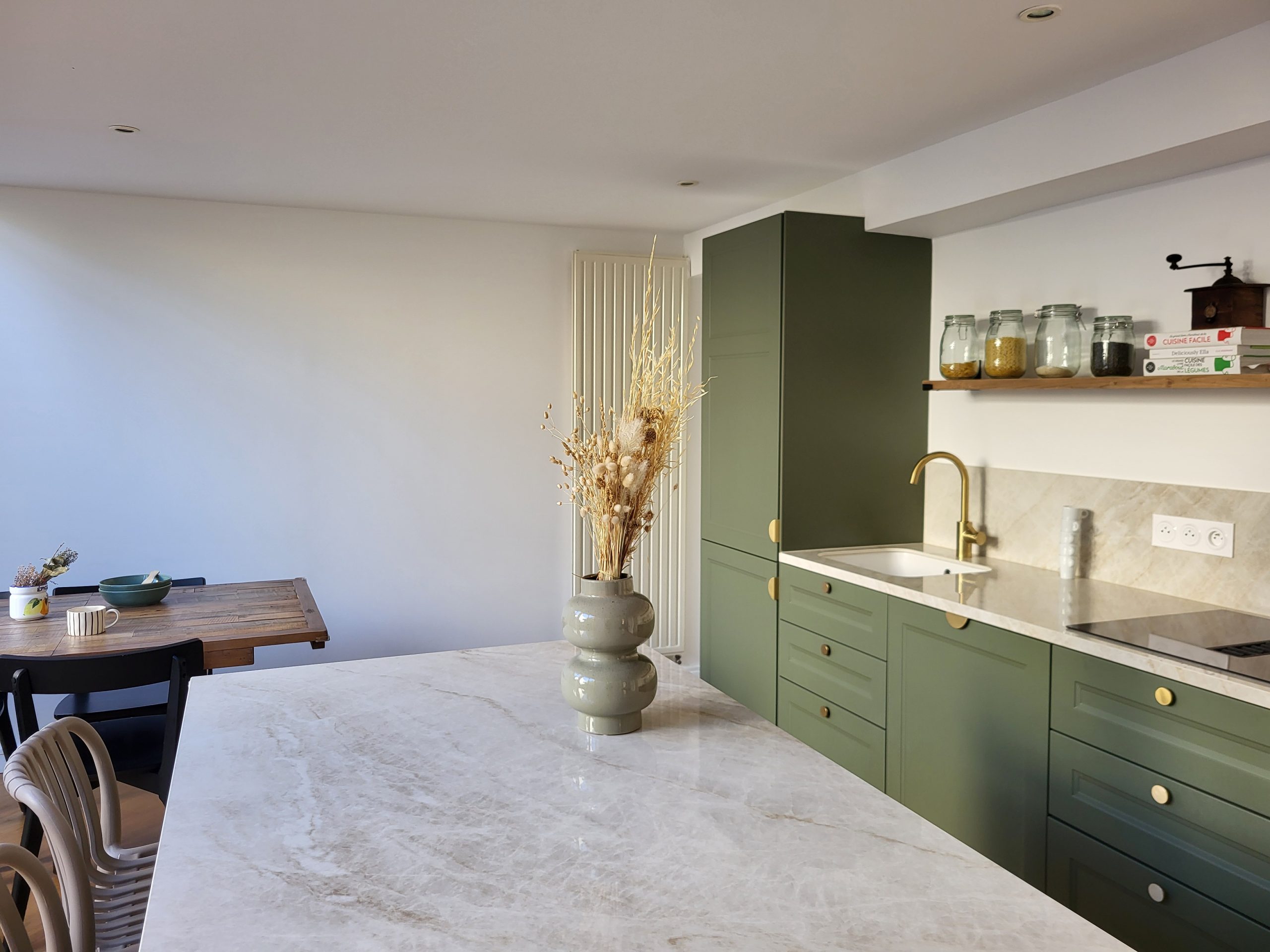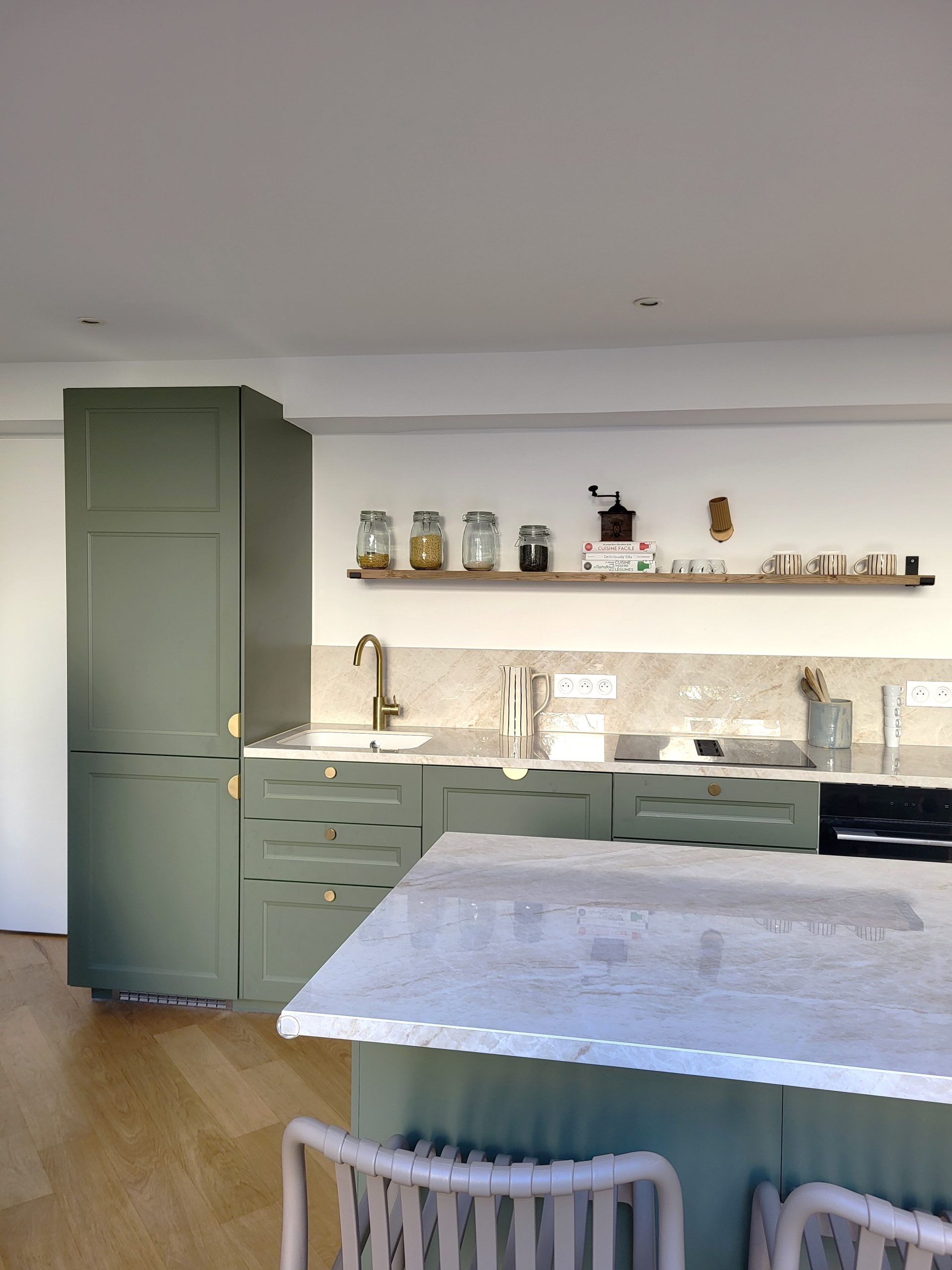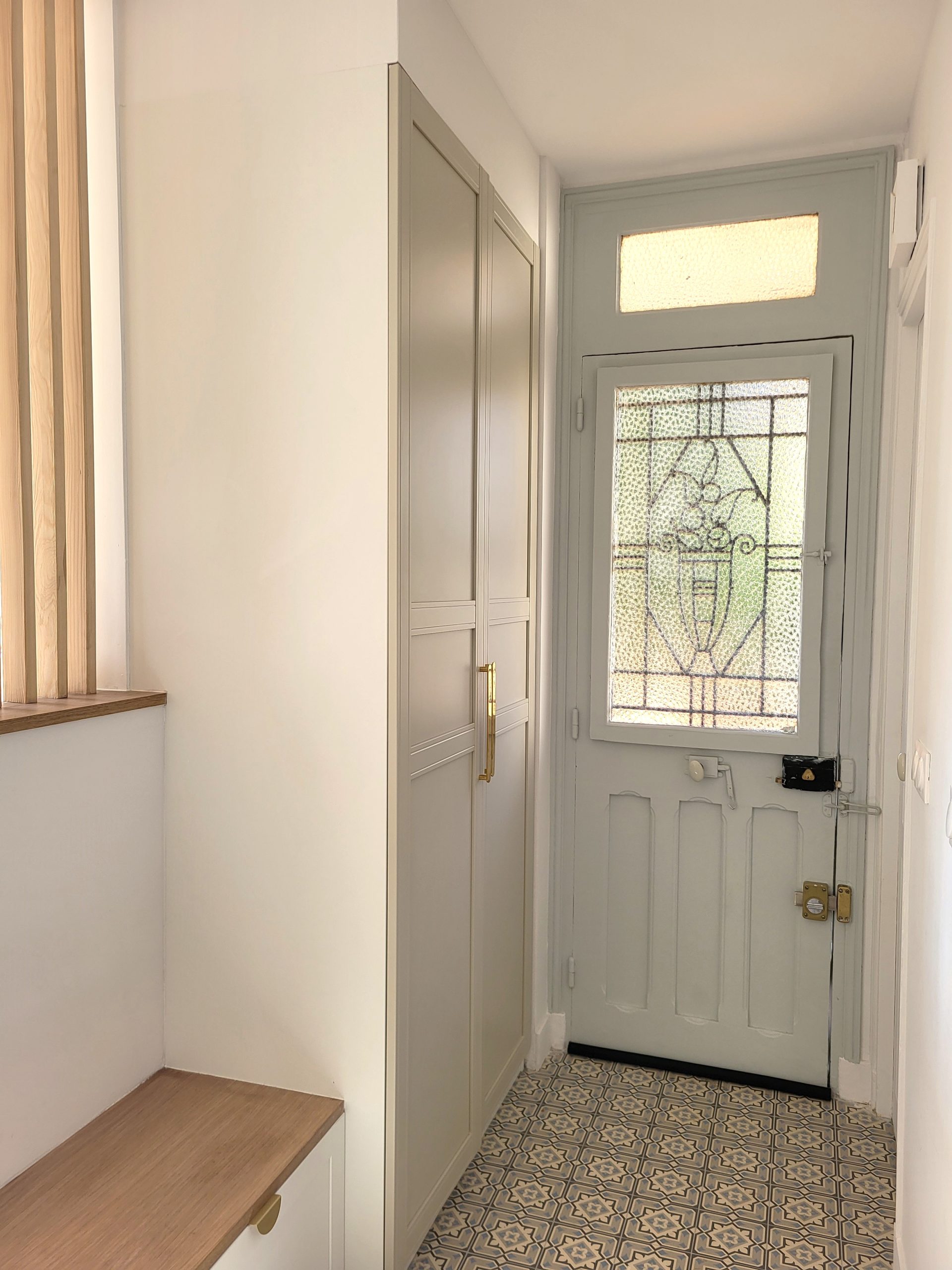 Nous avons rénové intégralement la maison en seulement deux mois et avons repensé les espaces de deux niveaux : ouverture de deux murs porteurs, déplacement de la cuisine de l’étage vers le niveau jardin, création d’une suite parentale en lieu et place de l’ancienne cuisine. L’entrée s’ouvre désormais sur un salon de réception baigné de lumière et dispose de rangements.