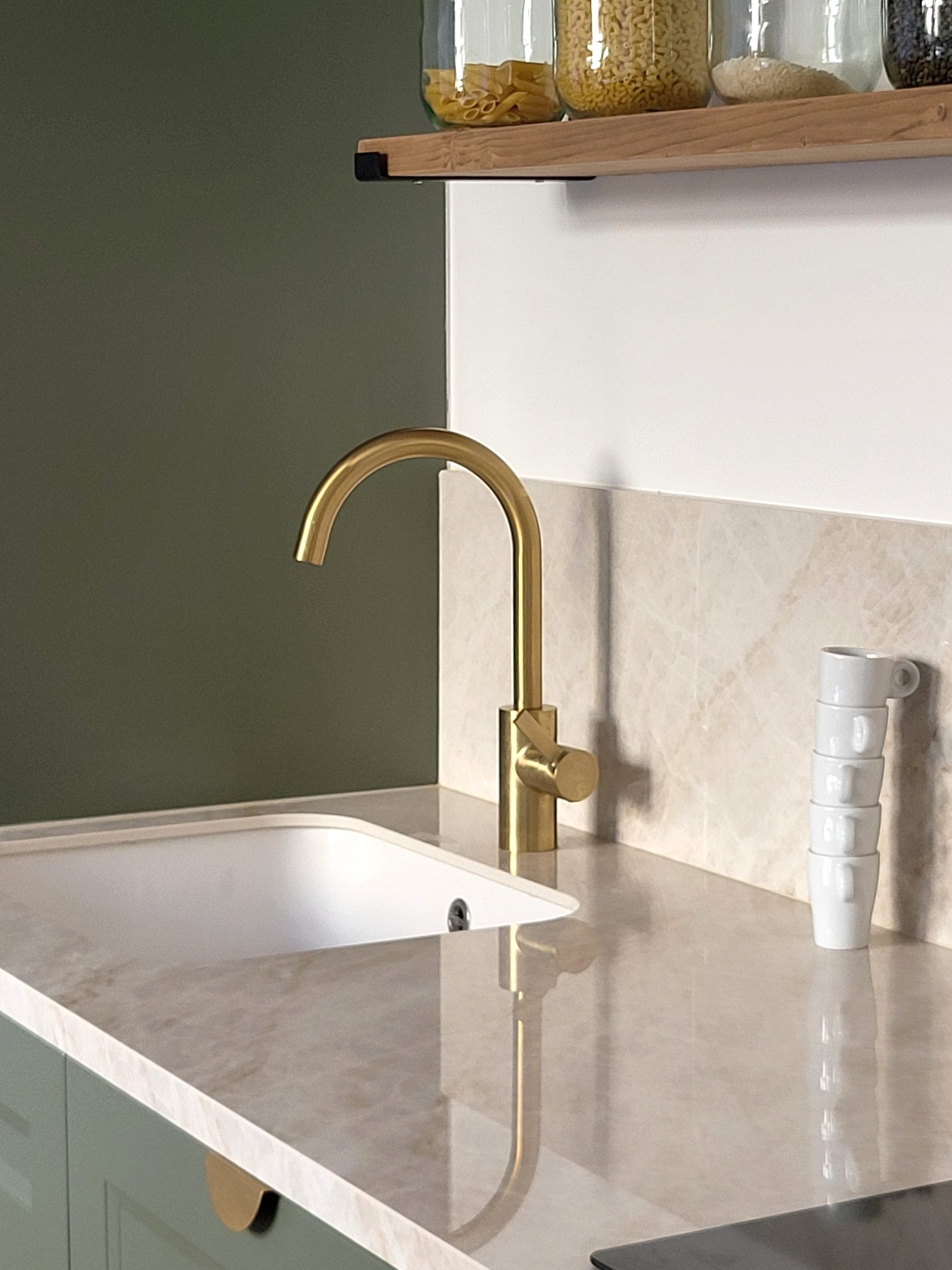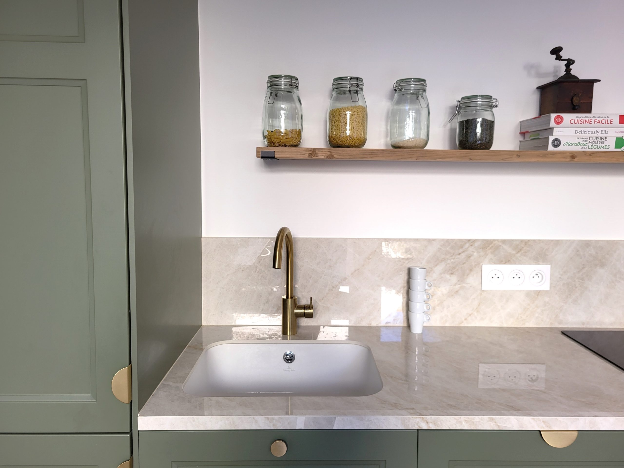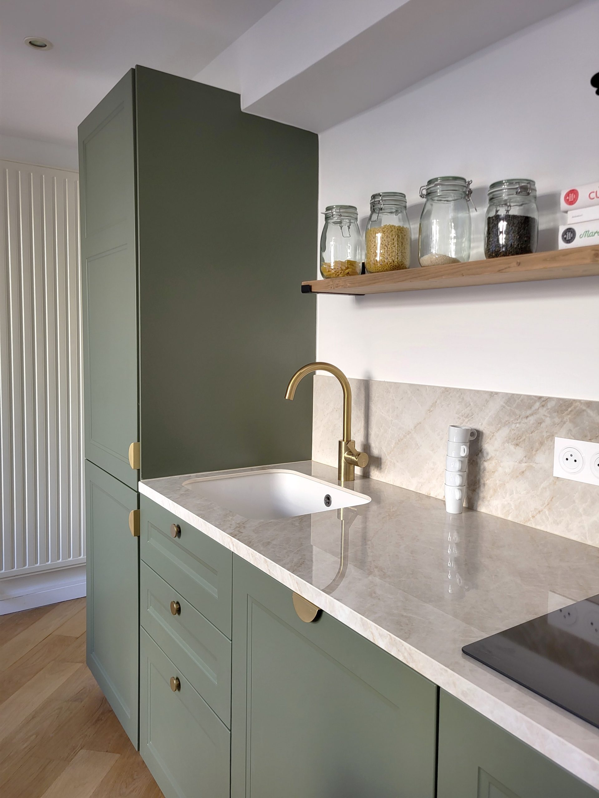 Nous avons rénové intégralement la maison en seulement deux mois et avons repensé les espaces de deux niveaux : ouverture de deux murs porteurs, déplacement de la cuisine de l’étage vers le niveau jardin, création d’une suite parentale en lieu et place de l’ancienne cuisine. L’entrée s’ouvre désormais sur un salon de réception baigné de lumière et dispose de rangements.