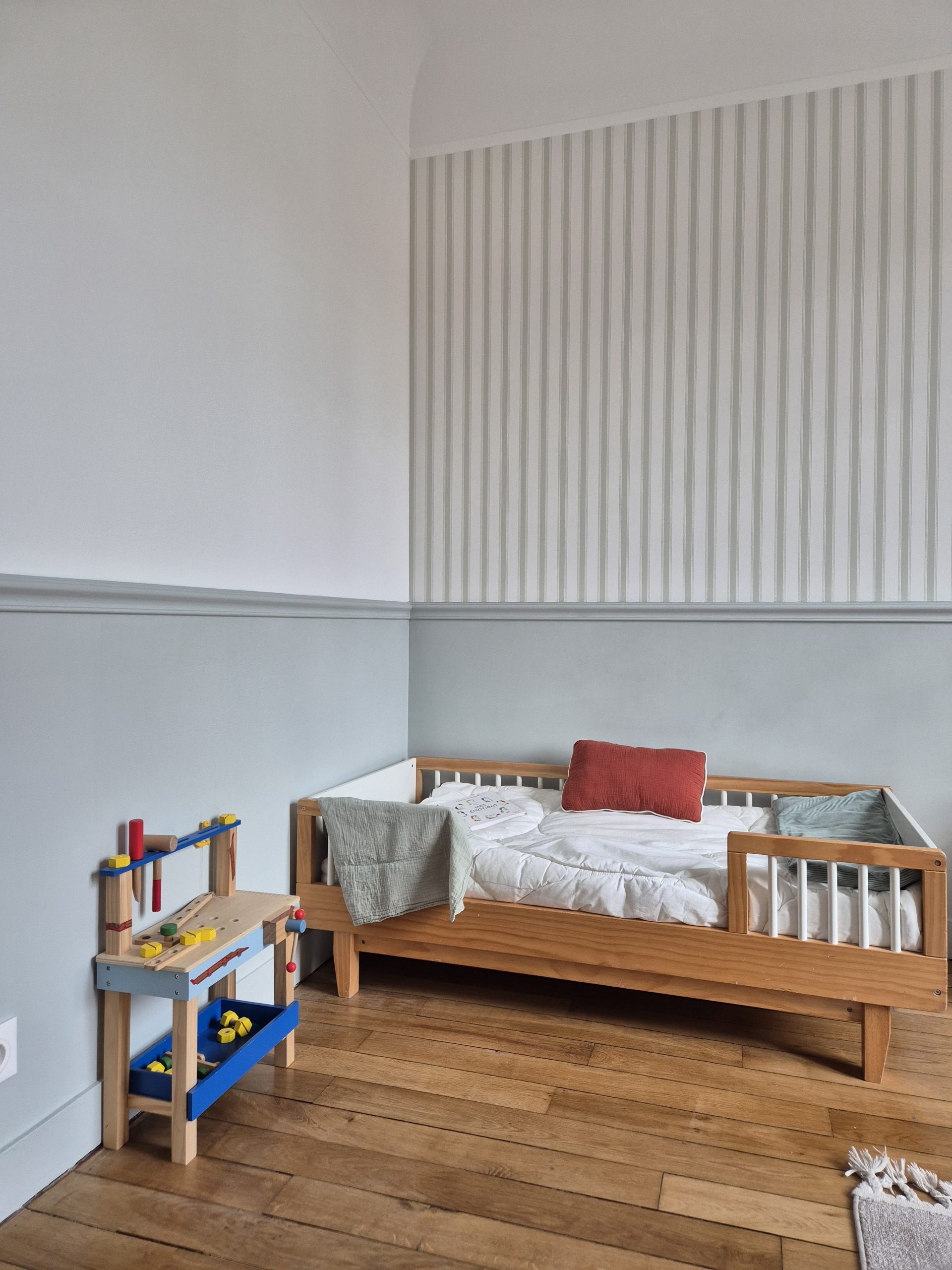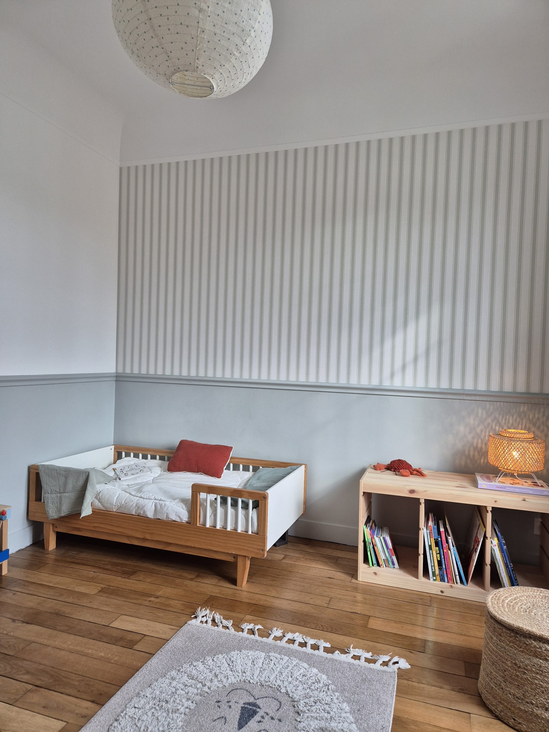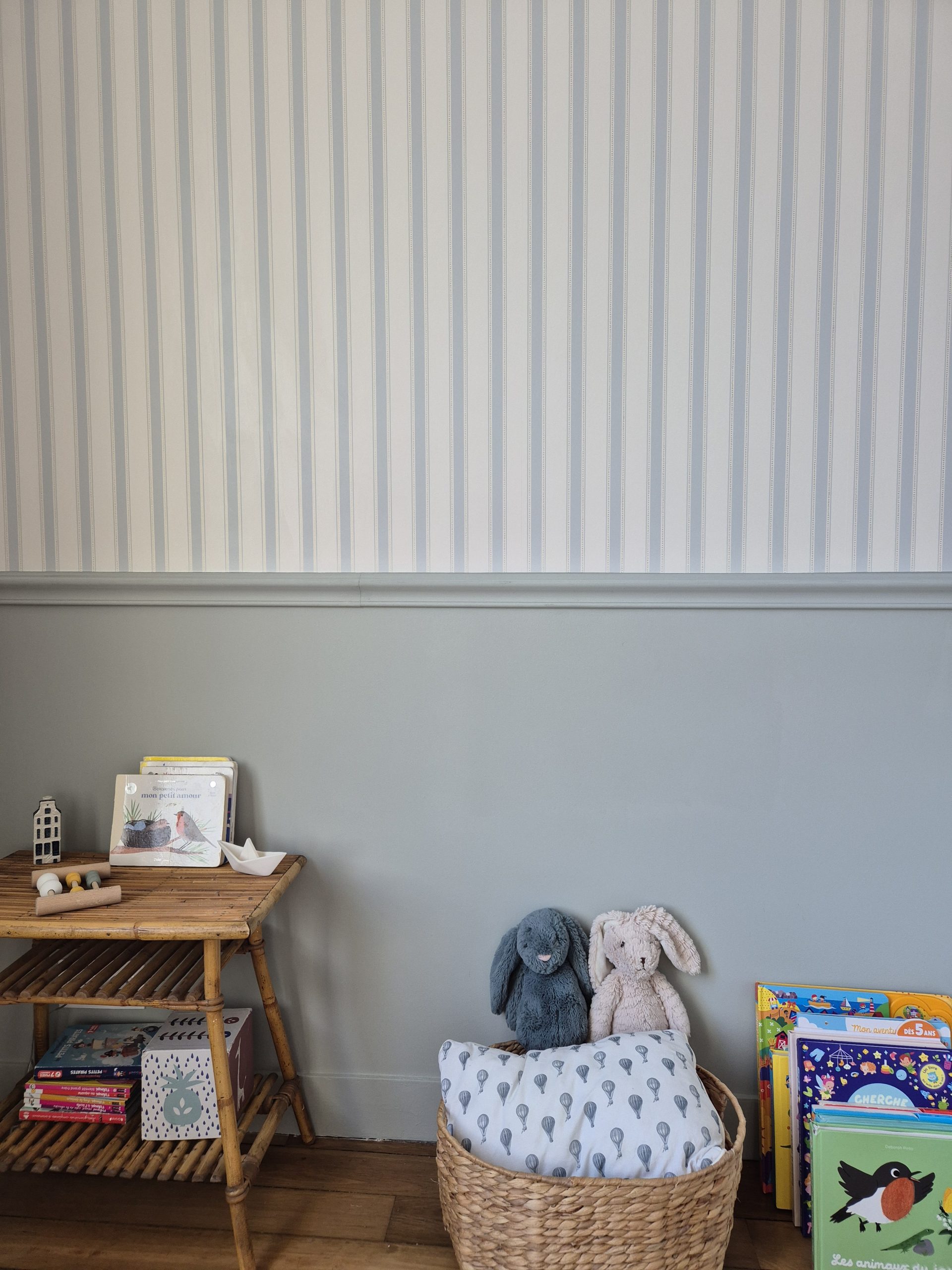 Le choix des papiers peints et les couleurs Farrow & Ball tissent un fil conducteur doux et enveloppant : palette sourde, bleus, verts, beiges intemporels… un véritable hommage au style « British cosy », sublimant le charme originel de cette demeure.